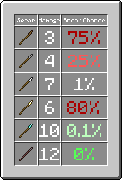 क्या आप असली भाला चलाने वाले योद्धा बनना चाहते हैं? तो फिर बस सही सामग्री चुनिए। उदाहरण के लिए, लकड़ी का भाला केवल 3 यूनिट डैमेज करता है और 75% संभावना है कि 2-3 बार फेंकने के बाद वह टूट जाएगा। दूसरी ओर, डायमंड स्पीयर सैकड़ों बार फेंका जा सकता है और बेहद ताकतवर दुश्मनों को भी हरा सकता है।