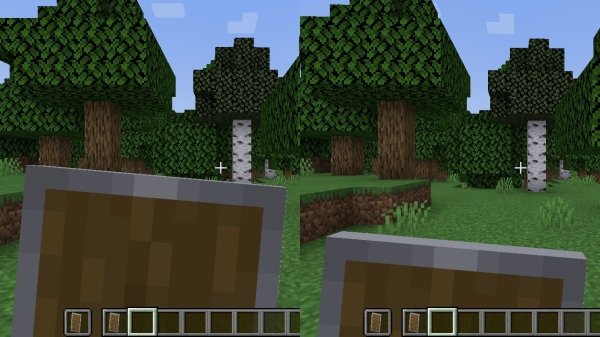 नीचे दिए गए स्क्रीनशॉट में आप तुलना कर सकते हैं कि टेक्स्चर इंस्टॉल करने से पहले और बाद में गेम की कस्टम-डिज़ाइन की गई ढालें कैसी दिखती हैं।