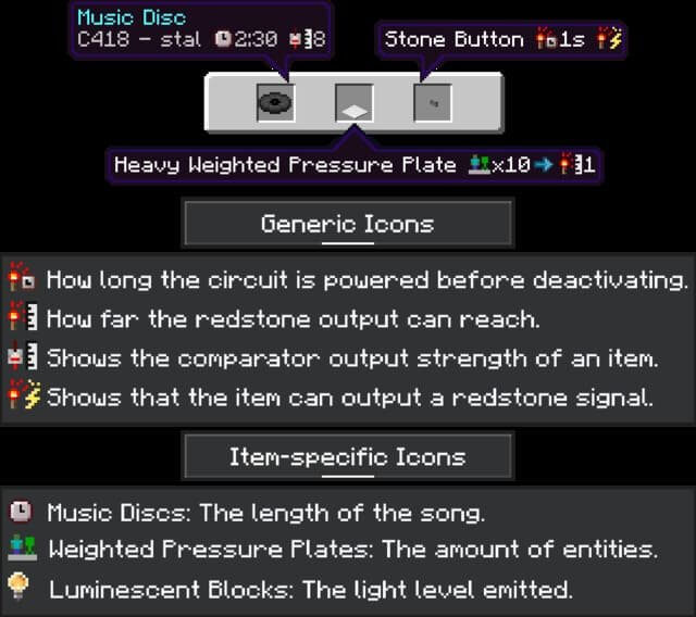 इस टेक्सचर की मदद से अतिरिक्त जानकारी वाले ब्लॉक्स को भी कस्टमाइज़ किया जा सकता है — जिनके उदाहरण स्क्रीनशॉट में दिखाए गए हैं। उदाहरण के लिए, आप म्यूज़िक डिस्क पर ट्रैक की लंबाई या रेडस्टोन के कुछ असामान्य फ़ंक्शन देख सकते हैं।